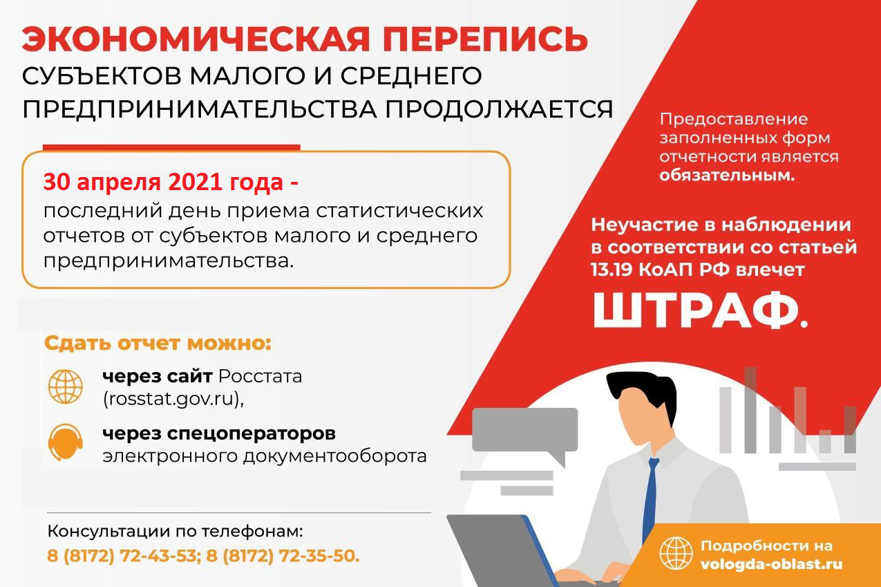 30 апреля 2021 года - последний день приема статистических отчетов субъектов малого и среднего предпринимательства в рамках Экономической переписи малого и среднего бизнеса за 2020 год (сплошного наблюдения) на бумажном носителе и в электронном виде.
