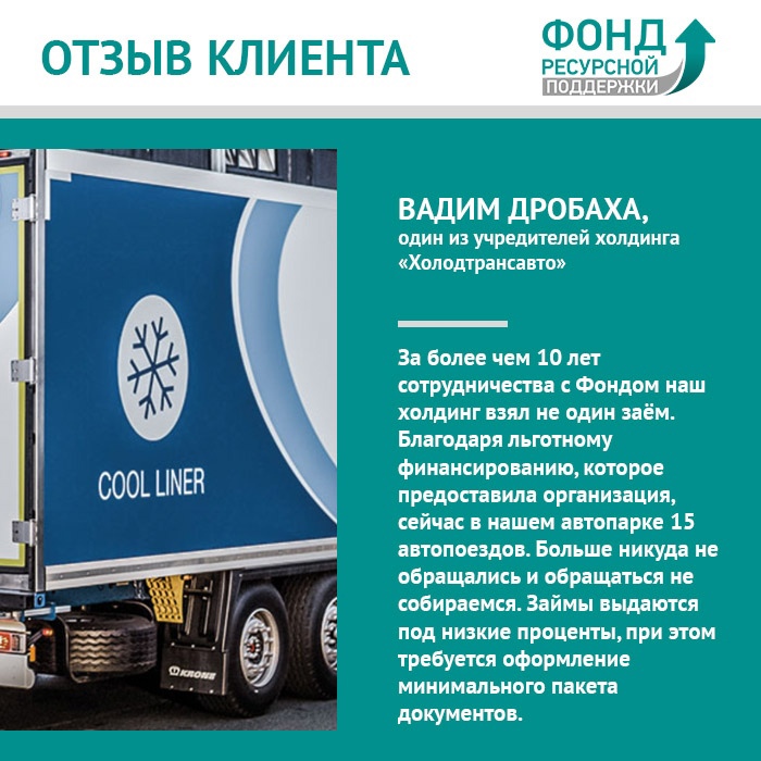 Об истории развития своего бизнеса благодаря сотрудничеству с Фондом рассказывает Вадим Дробаха, один из учредителей холдинга «Холодтрансавто». Компания занимается грузоперевозками по России и за рубеж